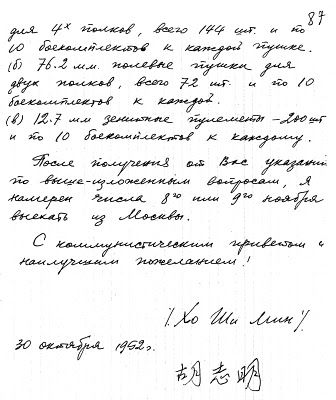 ngày mùng 8 hoặc là mùng 9 tháng 11 sẽ rời khỏi Moscow. Gửi tới đồng chí lời chào cộng sản và lời chúc túc đẹp nhất % Ho Shi Min % 30-10-1952 đã kí